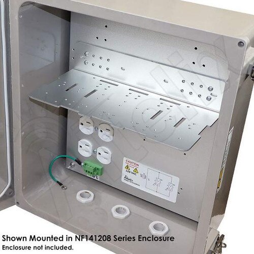 The Altelix NF1412xx 120VAC powered FRP enclosure series feature an aluminum equipment mounting plate that is pre-drilled and tapped with the holes required to mount the shelf. For those installations, use the #6-32 screws included in the accessory kit. The following enclosures feature these pre-drilled aluminum equipment mounting plates: