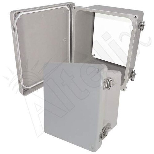The Altelix NF100806M NEMA 4X Weatherproof Enclosure is ideal for protecting equipment from harsh environments and tampering. This rugged NEMA box is molded from durable and UV resistant fiberglass reinforced polyester (FRP) with a UL94-5V flame rating. It features a gasketed door with stainless steel continuous hinge and stainless steel quick release latches with padlock hasps.