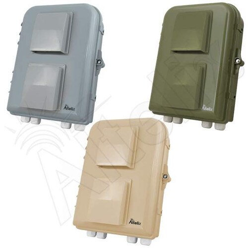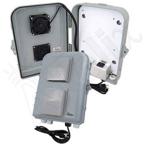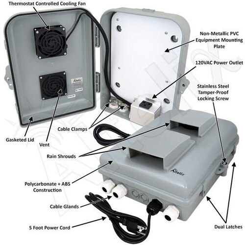 The Altelix NP131004VMFA1C NEMA enclosure is simple to install because no wiring is required. Simply mount the enclosure and plug the pre-wired 5 foot power cord into a nearby outlet. The non-metallic equipment mounting plate features a pre-wired 120VAC power outlet for your equipment. It is ideal for protecting small devices from harsh environments and tampering, while allowing ventilation for installed equipment or batteries.