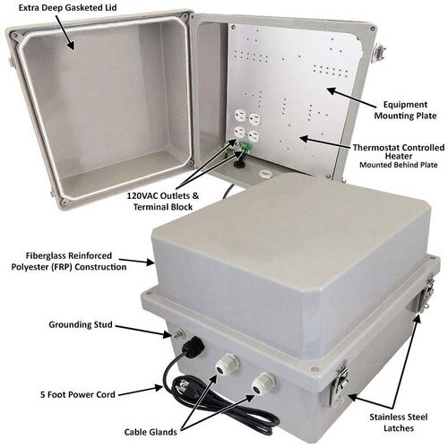 Altelix NF141210A1C - 14x12x10 Fiberglass Weatherproof NEMA Enclosure with Aluminum Mounting Plate, 120V Outlets & Power Cord
