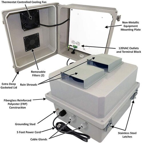 Altelix 14x12x10 Fiberglass Weatherproof Vented WiFi NEMA Enclosure with Polyester Equipment Mounting Plate, Cooling Fan, 120 VAC Outlets & Power Cord