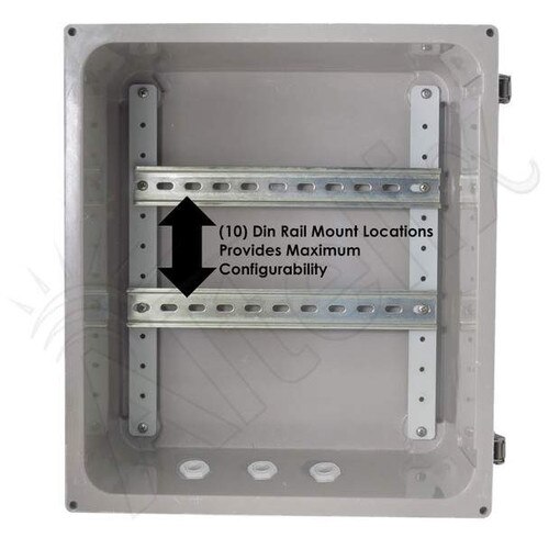 The Altelix NF141206-DIN NEMA 4X Weatherproof DIN Rail Enclosure features two heavy duty 12 gauge steel DIN rail mounting brackets that provide 10 adjustable DIN rail mounting positions. For convenience, the enclosure also includes two pre-cut steel 35mm top-hat rails and mounting hardware.