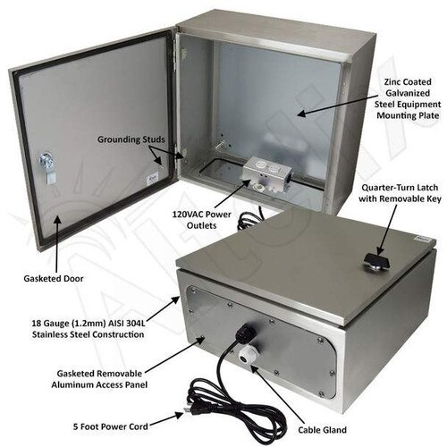 The Altelix NX161608A1C Stainless Steel NEMA 4X Weatherproof Enclosure with 120VAC Power and Equipment Plate is ideal for protecting equipment from harsh environments and tampering. Equipment designed for indoor use can now be located outside.