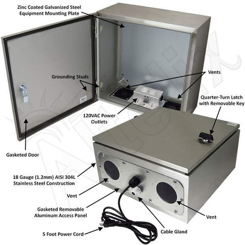 The Altelix NX161608VA1C Vented Stainless Steel Weatherproof NEMA Enclosure with 120VAC Power and Equipment Plate is ideal for protecting equipment from harsh environments and tampering. Equipment designed for indoor use can now be located outside.