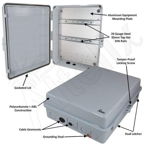 This enclosure includes a 2.0mm thick finished aluminum equipment mounting plate and two steel 35mm Top Hat DIN rails. The enclosure is molded out of UV resistant Polycarbonate + ABS, an industrial grade plastic with greater strength and durability than standard ABS. It features a gasketed hinged door with dual latches, a stainless steel security screw and provision for a padlock. Knock-out holes are provided on the top and bottom. It meets or exceeds NEMA Type 3, 3X and IEC IP55.