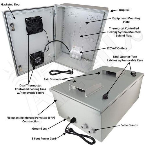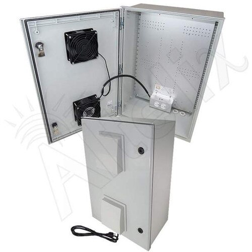 The Altelix NFC241609VFHA1C Heated and Fan Cooled Weatherproof NEMA Enclosure with 120VAC Power and Equipment Mounting Plate is ideal for protecting equipment from harsh environments and tampering. Equipment designed for indoor use can now be located outside.