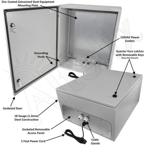 The Altelix NS242012A1C NEMA 4X Steel Weatherproof Enclosure with 120VAC Power and Equipment Plate is ideal for protecting equipment from harsh environments and tampering. Equipment designed for indoor use can now be located outside.