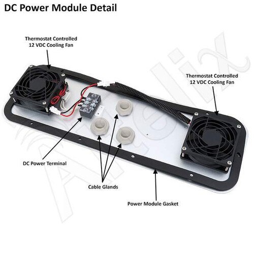 The NS242012VFD1 features a removable power and fan module that attaches to the bottom of the enclosure. Constructed of rugged aluminum, this can be easily removed for servicing and is fully gasketed to ensure a proper seal. This power module features the two 12VDC cooling fans and the DC power terminal strip.