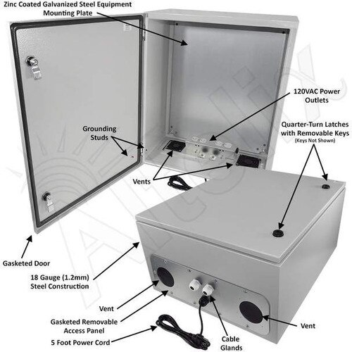The Altelix NS242012VA1C Vented Steel Weatherproof NEMA Enclosure with 120VAC Power and Equipment Plate is ideal for protecting equipment from harsh environments and tampering. Equipment designed for indoor use can now be located outside.