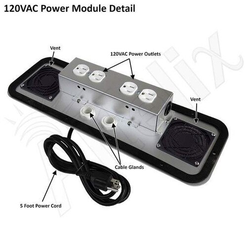 The NS242012VA1C features a removable power module that attaches to the bottom of the enclosure. Constructed of rugged aluminum, this can be easily removed for servicing and is fully gasketed to ensure a proper seal. This power module features two pre-wired duplex 120VAC power outlets (4 outlets total) and a pre-wired 5 foot power cord, so no additional wiring is required.