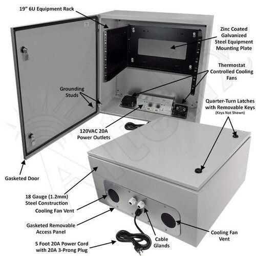 The Altelix NS242412VFA1C-20A-R6U 19" Rack 6U Steel Fan Cooled Weatherproof NEMA Enclosure with 120VAC 20A Power and Equipment Plate is ideal for protecting rack mountable 20A electronic equipment from harsh environments and tampering. Equipment designed for indoor use can now be located outside.