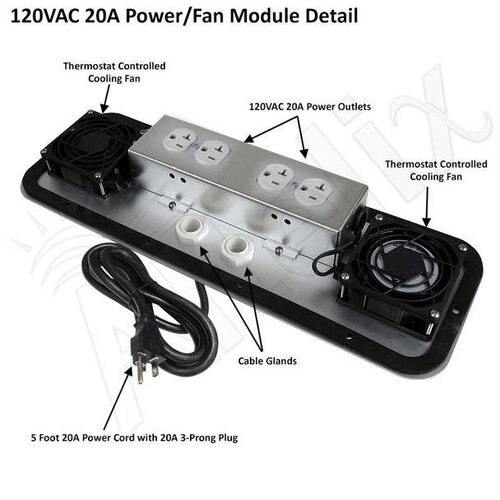 The NS242412VFA1C-20A-R6U features a removable power and fan module that attaches to the bottom of the enclosure. Constructed of rugged aluminum, this can be easily removed for servicing and is fully gasketed to ensure a proper seal. This power module features two pre-wired duplex 120VAC 20A power outlets (4 outlets total) and a pre-wired 20A 5 foot power cord with a 3-prong plug, so no additional wiring is required.