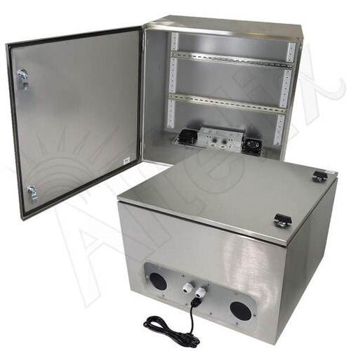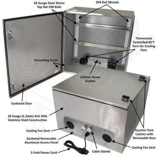 Altelix NX242416VFA1C-85-DIN - 24x24x16 Industrial DIN Rail Stainless Steel Weatherproof NEMA Enclosure with 120 VAC Outlets, Power Cord & 85°F Turn-On Cooling Fans