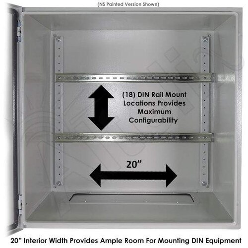 Included with this enclosure are (2) DIN Mounting Rails. These rails mount to the interior of enclosure and are designed for use with (3) 35mm top hat DIN rails included with the enclosure. This versatile DIN rail mounting system runs the full length of the enclosure from top to bottom. This allows the Top Hat DIN rails to be mounted easily in any of 18 locations providing the flexibility needed when configuring the enclosure for specific user requirements. Hardware for mounting the Top Hat DIN rails is included.