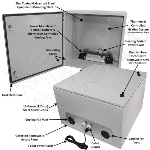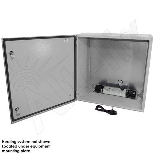 The Altelix NS242416VFHA1C Steel Heated and Fan Cooled Weatherproof NEMA Enclosure with 120VAC Power and Equipment Plate is ideal for protecting equipment from harsh environments and tampering. Equipment designed for indoor use can now be located outside.