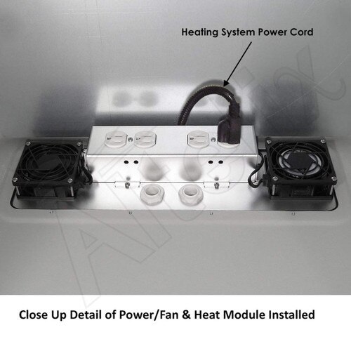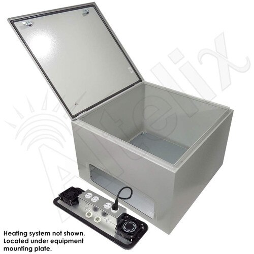 Ideal for cold environments, this model also features two 200W (400W total) thermostat controlled heaters. The heaters turns on when the internal temperature reaches 43°F (6°C) and turns off when it rises to 59°F (15°C). Both heaters are situated below the equipment mounting plate and wired internally so it does not interfere with user installed equipment. The heating system receives its power via a power cord which plugs into one of the available 120VAC outlets.