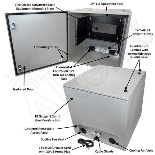 The Altelix NS242424VFA1C-20A-85-R6U 19" Rack 6U Steel Fan Cooled Weatherproof NEMA Enclosure with 120VAC 20A Power and Equipment Plate is ideal for protecting rack mountable UPS power systems as well as other 20A electronic equipment from harsh environments and tampering. Equipment designed for indoor use can now be located outside.