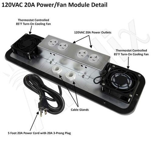 The NS242424VFA1C-20A-85-R6U features a removable power and fan module that attaches to the bottom of the enclosure. Constructed of rugged aluminum, this can be easily removed for servicing and is fully gasketed to ensure a proper seal. This power module features two pre-wired duplex 120VAC 20A power outlets (4 outlets total) and a pre-wired 20A 5 foot power cord with a 3-prong plug, so no additional wiring is required.