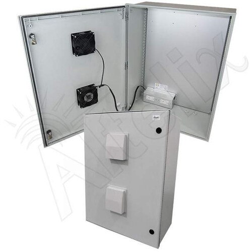 The Altelix NFC322412VFA1-85 Vented Fan Cooled Weatherproof NEMA Enclosure with 120VAC Power and Equipment Plate is ideal for protecting equipment from harsh environments and tampering. Equipment designed for indoor use can now be located outside.