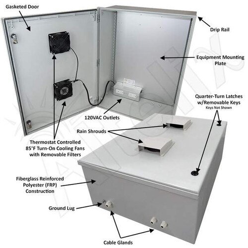 Altelix NFC322412VFA1-85 - 32x24x12 Vented Fiberglass Weatherproof NEMA Enclosure with 120 VAC Outlets & Dual 85°F Turn-On Cooling Fans