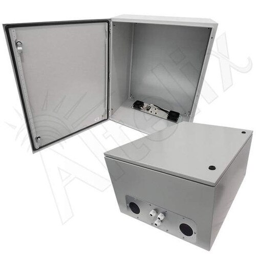 This configuration consists of the steel NEMA enclosure with hinged door and a 18 Gauge (1.2mm thick) zinc coated galvanized steel plate for mounting and securing equipment. The enclosure and plate can be drilled and modified by the installer to suit unique site requirements.
