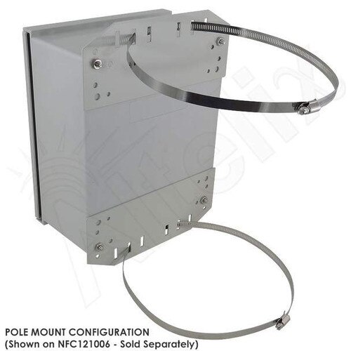 The Altelix NMKS-250-08 Pole Mount / Flange Mount Kit attaches to the rear of our NFC121006 and NS121006 series NEMA enclosures. These heavy duty steel brackets allow the enclosures to be mounted to poles 2.0 to 7.6 inches (50.8 to 194.5mm) in diameter. The mounting bracket features multiple locations to thread the stainless steel bands so that small to large poles can be accommodated. The mounting brackets are constructed from 0.08" (2mm) thick steel and are coated for all weather applications.