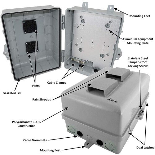 The Altelix Utility Box comes with a host of additional features, including two 2¼" vents with rain shields and screens, a 2.0mm thick finished aluminum equipment mounting plate, and a range of accessories such as cable glands, zip ties, cable management clips, hook & loop straps, and wall mount hardware.