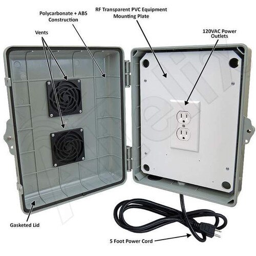 The Altelix WiFi Extender enclosure provides easy plug-n-play installation. Once the enclosure is mounted, plug the Netgear® EX3700 AC750 into the pre-wired 120VAC power outlet. Then plug the enclosure's 5 foot power cord into a 120VAC power outlet and you are up and running. A cable grommet on the enclosure allow cables to be connected to the device if needed.