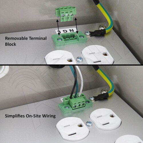 This enclosure features our 120VAC top entry terminal block. It is easily removable which helps simplify on-site wiring. It can accept wires sizes from 12 to 18 AWG. The wires are secured by side terminal screws.