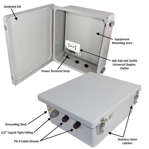 This configuration consists of the fiberglass NEMA enclosure with hinged lid and a 2.5mm thick finished aluminum plate with a pre-wired 100-240VAC duplex universal power outlet supporting multiple international power standards. A terminal strip and ground lug are provided for simplified wiring on-site. One 1/2" liquid-tight gland is provided for the AC supply along with two PG9 cable glands for low voltage wiring. This enclosure is designed to operate at the following voltages: