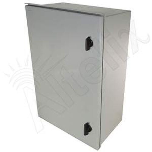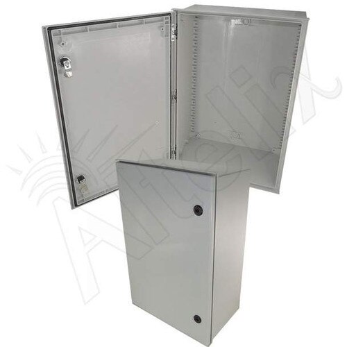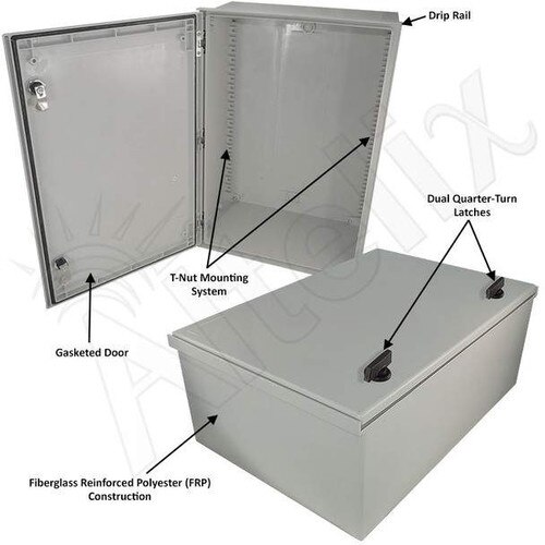 The Altelix 24” x 16” x 9” NEMA 3X Weatherproof Enclosure is ideal for protecting equipment from harsh environments and tampering. Any equipment designed for indoor use can now be located outside. This rugged IP65 rated enclosure is molded from durable and UV resistant fiberglass reinforced polyester (FRP). The door is fully gasketed making this enclosure suitable for use indoors or outdoors. The door features reinforced hinges and dual quarter-turn latches to secure the enclosure. A drip rail over the door provides additional protection against water dripping into the cabinet while the enclosure is wet. This base configuration consists of the fiberglass enclosure with a hinged lid. It can be drilled and modified by the installer to suit unique site requirements.