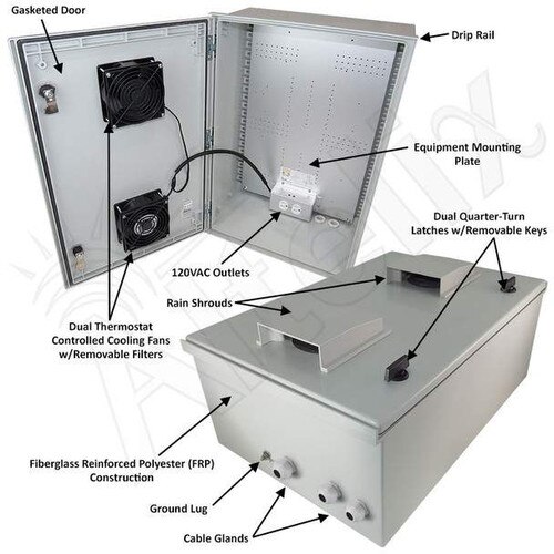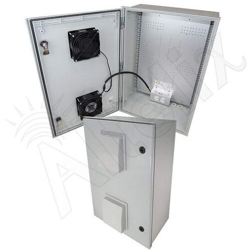 The Altelix 24” x 16” x 9” Vented Fan Cooled Weatherproof NEMA Enclosure with 120VAC Power and Equipment Mounting Plate is ideal for protecting equipment from harsh environments and tampering. Any equipment designed for indoor use can now be located outside. This rugged rated enclosure is molded from durable and UV resistant fiberglass reinforced polyester (FRP). The door is fully gasketed making this enclosure suitable for use indoors or outdoors. The door features reinforced hinges and dual quarter-turn latches to secure the enclosure. A drip rail over the door provides additional protection against water dripping into the cabinet while the enclosure is wet. This configuration consists of the fiberglass enclosure with a hinged lid and an equipment mounting plate with two pre-wired 120VAC power outlets. The outlet box is easily removable to facilitate wiring to an external power source. To help expel heat from within the enclosure, this features two 4” air vents with rain shields and dual thermostat controlled cooling fans. This helps maintain lower internal temperatures by allowing air to be either pushed or pulled through the enclosure The equipment mounting plate is provided for mounting and securing equipment.