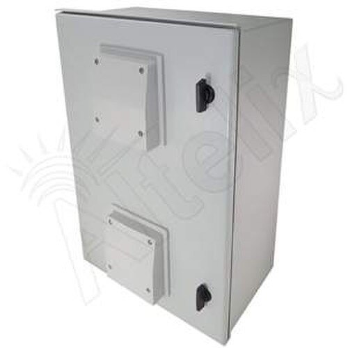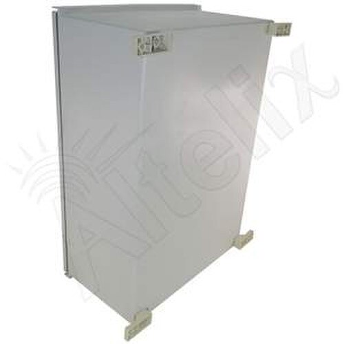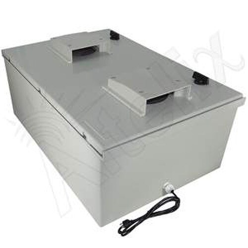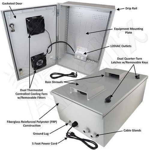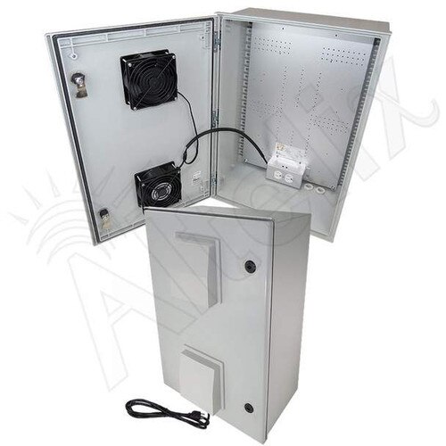 The Altelix 24” x 16” x 9” Vented Fan Cooled Weatherproof NEMA Enclosure with 120VAC Power, Equipment Mounting Plate and Power Cord is ideal for protecting equipment from harsh environments and tampering. Any equipment designed for indoor use can now be located outside. This rugged rated enclosure is molded from durable and UV resistant fiberglass reinforced polyester (FRP). The door is fully gasketed making this enclosure suitable for use indoors or outdoors. The door features reinforced hinges and dual quarter-turn latches to secure the enclosure. A drip rail over the door provides additional protection against water dripping into the cabinet while the enclosure is wet. This configuration consists of the fiberglass enclosure with a hinged lid and an equipment mounting plate with two pre-wired 120VAC power outlets and a 5' pre-wired power cord to provide power to the 120VAC outlet. The outlet box is easily removable to facilitate wiring to an external power source.