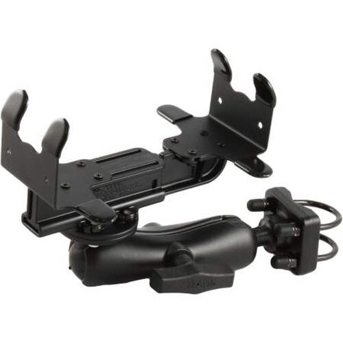RAM MOUNTS Quick Draw Jr. holders with double u-bolt mount. The double u-bolt mount will fit pipes from 0.5" to 1.25" in diameter. Including a 1.5" diameter ball, for extra holding support, the base connects to the pipe with two stainless steel u-bolts. This model has short side clamps.