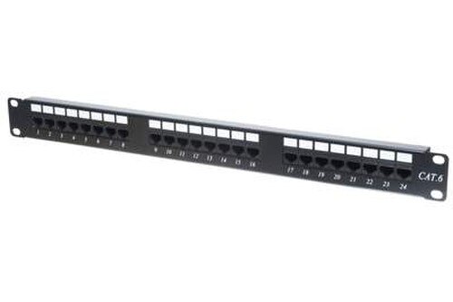 The CAT6 Unshielded 24 Port Patch Panel is a multi-user unshielded communication jack that is designed for network cabling solutions using unshielded CAT6 cable. This black CAT6 unshielded 24 Port Patch Panel is made of high quality black metal and includes blanks above each port for ease in labeling.